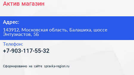 Актив, магазин по адресу 143912, Московская область, Балашиха, шоссе Энтузиастов, 5Б в дальнейшем Организация, размещена в следующих категориях: