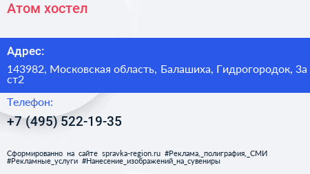 Атом, хостел по адресу 143982, Московская область, Балашиха, Гидрогородок, 3а ст2 в дальнейшем Организация, размещена в следующих категориях: