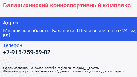 Балашихинский конноспортивный комплекс по адресу Московская область, Балашиха, Щёлковское шоссе 24 км, вл1 в дальнейшем Организация, размещена в следующих категориях: