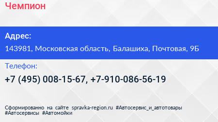 Чемпион по адресу 143981, Московская область, Балашиха, Почтовая, 9Б в дальнейшем Организация, размещена в следующих категориях: