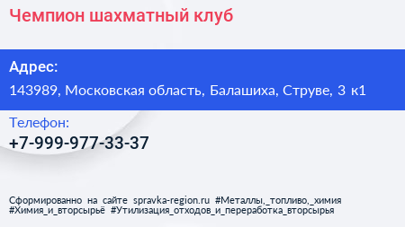 Чемпион, шахматный клуб по адресу 143989, Московская область, Балашиха, Струве, 3 к1 в дальнейшем Организация, размещена в следующих категориях: