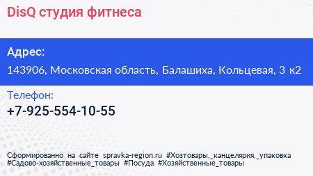 DisQ, студия фитнеса по адресу 143906, Московская область, Балашиха, Кольцевая, 3 к2 в дальнейшем Организация, размещена в следующих категориях: