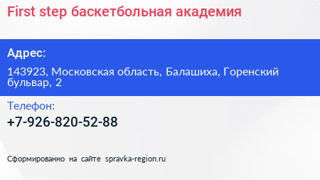 First step, баскетбольная академия по адресу 143923, Московская область, Балашиха, Горенский бульвар, 2 в дальнейшем Организация, размещена в следующих категориях: