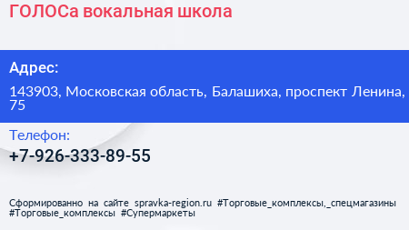 ГОЛОСа, вокальная школа по адресу 143903, Московская область, Балашиха, проспект Ленина, 75 в дальнейшем Организация, размещена в следующих категориях: