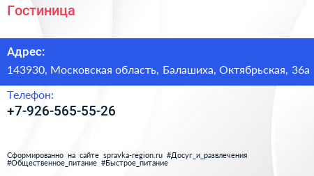 Гостиница по адресу 143930, Московская область, Балашиха, Октябрьская, 36а в дальнейшем Организация, размещена в следующих категориях: