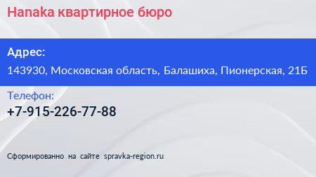 Hanaka, квартирное бюро по адресу 143930, Московская область, Балашиха, Пионерская, 21Б в дальнейшем Организация, размещена в следующих категориях: