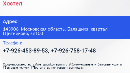 Хостел по адресу 143906, Московская область, Балашиха, квартал Щитниково, вл103 в дальнейшем Организация, размещена в следующих категориях: