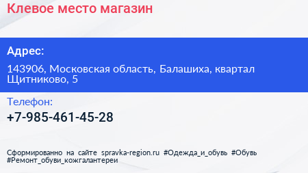 Клевое место, магазин по адресу 143906, Московская область, Балашиха, квартал Щитниково, 5 в дальнейшем Организация, размещена в следующих категориях: