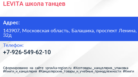 LEVITA, школа танцев по адресу 143907, Московская область, Балашиха, проспект Ленина, 32д в дальнейшем Организация, размещена в следующих категориях: