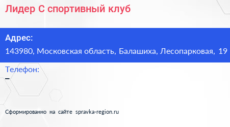 Лидер-С, спортивный клуб по адресу 143980, Московская область, Балашиха, Лесопарковая, 19 в дальнейшем Организация, размещена в следующих категориях: