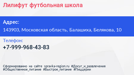 Лилифут, футбольная школа по адресу 143903, Московская область, Балашиха, Белякова, 10 в дальнейшем Организация, размещена в следующих категориях:
