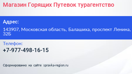 Магазин Горящих Путевок, турагентство по адресу 143907, Московская область, Балашиха, проспект Ленина, 32Б в дальнейшем Организация, размещена в следующих категориях: