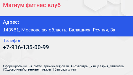 Магнум, фитнес-клуб по адресу 143981, Московская область, Балашиха, Речная, 3а в дальнейшем Организация, размещена в следующих категориях: