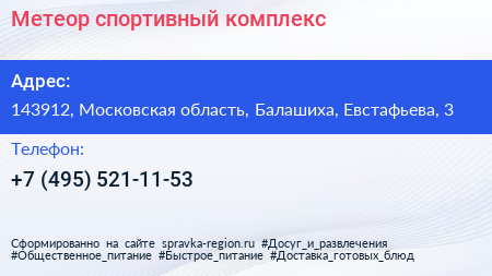 Метеор, спортивный комплекс по адресу 143912, Московская область, Балашиха, Евстафьева, 3 в дальнейшем Организация, размещена в следующих категориях:
