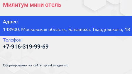 Милитум, мини-отель по адресу 143900, Московская область, Балашиха, Твардовского, 18 в дальнейшем Организация, размещена в следующих категориях: