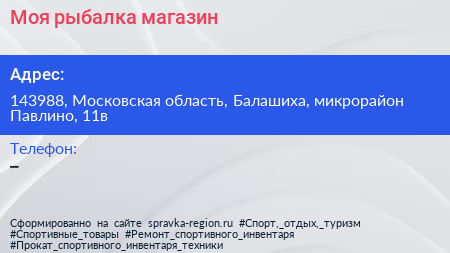 Моя рыбалка, магазин по адресу 143988, Московская область, Балашиха, микрорайон Павлино, 11в в дальнейшем Организация, размещена в следующих категориях: