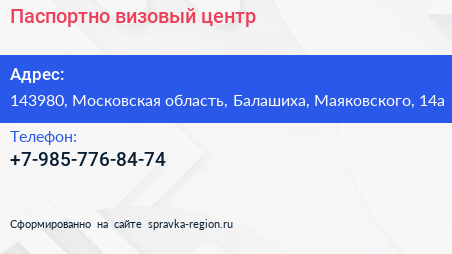 Паспортно-визовый центр по адресу 143980, Московская область, Балашиха, Маяковского, 14а в дальнейшем Организация, размещена в следующих категориях: