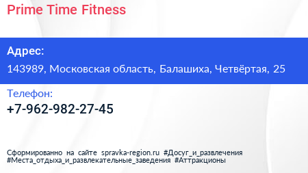 Prime Time Fitness по адресу 143989, Московская область, Балашиха, Четвёртая, 25 в дальнейшем Организация, размещена в следующих категориях: