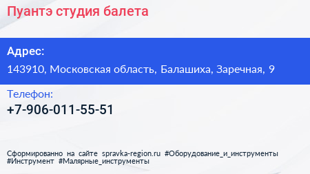 Пуантэ, студия балета по адресу 143910, Московская область, Балашиха, Заречная, 9 в дальнейшем Организация, размещена в следующих категориях: