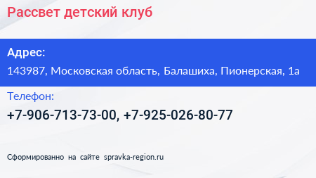 Рассвет, детский клуб по адресу 143987, Московская область, Балашиха, Пионерская, 1а в дальнейшем Организация, размещена в следующих категориях: