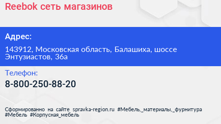 Reebok, сеть магазинов по адресу 143912, Московская область, Балашиха, шоссе Энтузиастов, 36а в дальнейшем Организация, размещена в следующих категориях: