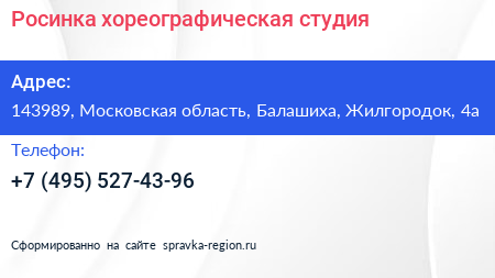 Росинка, хореографическая студия по адресу 143989, Московская область, Балашиха, Жилгородок, 4а в дальнейшем Организация, размещена в следующих категориях: