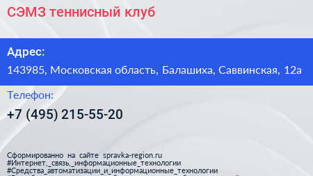 СЭМЗ, теннисный клуб по адресу 143985, Московская область, Балашиха, Саввинская, 12а в дальнейшем Организация, размещена в следующих категориях: