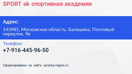 SPORT-ak, спортивная академия по адресу 143981, Московская область, Балашиха, Почтовый переулок, 9в в дальнейшем Организация, размещена в следующих категориях: