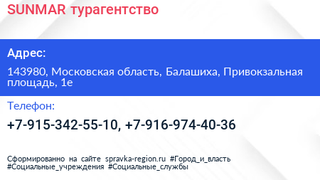 SUNMAR, турагентство по адресу 143980, Московская область, Балашиха, Привокзальная площадь, 1е в дальнейшем Организация, размещена в следующих категориях: