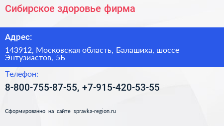 Сибирское здоровье, фирма по адресу 143912, Московская область, Балашиха, шоссе Энтузиастов, 5Б в дальнейшем Организация, размещена в следующих категориях: