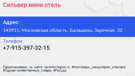 Сильвер, мини-отель по адресу 143915, Московская область, Балашиха, Заречная, 32 в дальнейшем Организация, размещена в следующих категориях: