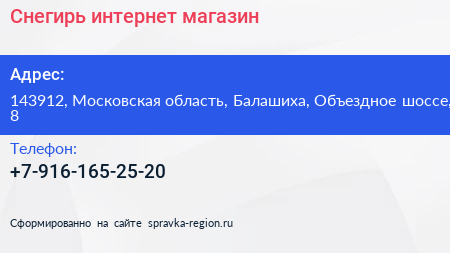 Снегирь, интернет-магазин по адресу 143912, Московская область, Балашиха, Объездное шоссе, 8 в дальнейшем Организация, размещена в следующих категориях:
