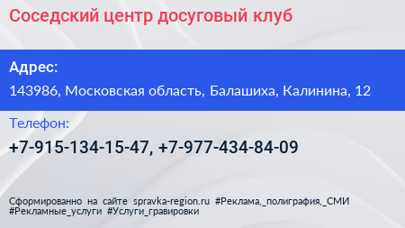 Соседский центр, досуговый клуб по адресу 143986, Московская область, Балашиха, Калинина, 12 в дальнейшем Организация, размещена в следующих категориях: