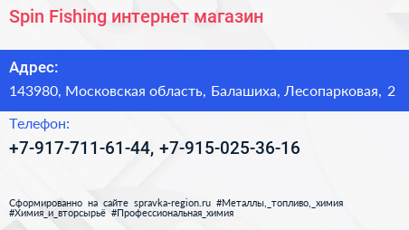 Spin-Fishing, интернет-магазин по адресу 143980, Московская область, Балашиха, Лесопарковая, 2 в дальнейшем Организация, размещена в следующих категориях: