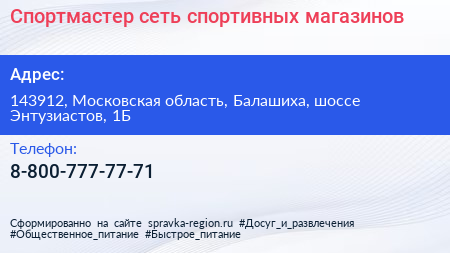 Спортмастер, сеть спортивных магазинов по адресу 143912, Московская область, Балашиха, шоссе Энтузиастов, 1Б в дальнейшем Организация, размещена в следующих категориях: