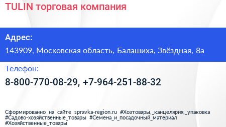 TULIN, торговая компания по адресу 143909, Московская область, Балашиха, Звёздная, 8а в дальнейшем Организация, размещена в следующих категориях: