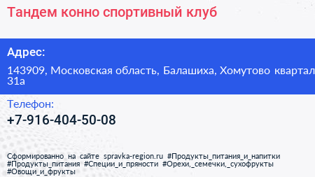 Тандем, конно-спортивный клуб по адресу 143909, Московская область, Балашиха, Хомутово квартал, 31а в дальнейшем Организация, размещена в следующих категориях: