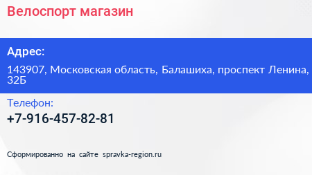 Велоспорт, магазин по адресу 143907, Московская область, Балашиха, проспект Ленина, 32Б в дальнейшем Организация, размещена в следующих категориях: