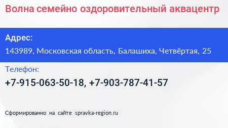 Волна, семейно-оздоровительный аквацентр по адресу 143989, Московская область, Балашиха, Четвёртая, 25 в дальнейшем Организация, размещена в следующих категориях: