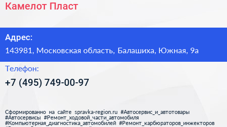 Камелот Пласт по адресу 143981, Московская область, Балашиха, Южная, 9а в дальнейшем Организация, размещена в следующих категориях:
