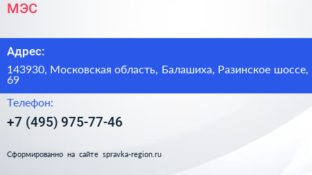 МЭС по адресу 143930, Московская область, Балашиха, Разинское шоссе, 69 в дальнейшем Организация, размещена в следующих категориях: