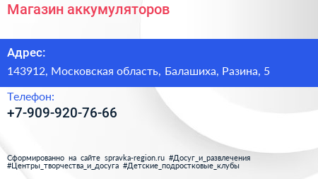 Магазин аккумуляторов по адресу 143912, Московская область, Балашиха, Разина, 5 в дальнейшем Организация, размещена в следующих категориях: