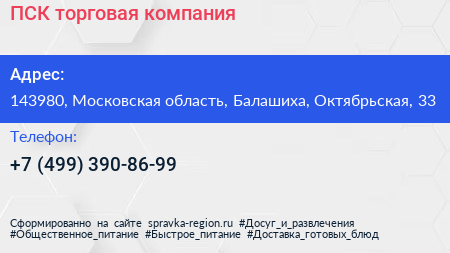ПСК, торговая компания по адресу 143980, Московская область, Балашиха, Октябрьская, 33 в дальнейшем Организация, размещена в следующих категориях: