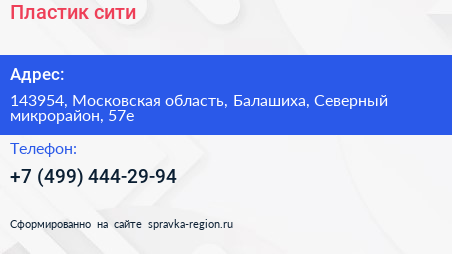 Пластик сити по адресу 143954, Московская область, Балашиха, Северный микрорайон, 57е в дальнейшем Организация, размещена в следующих категориях: