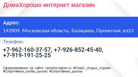 ДомаХорошо, интернет-магазин по адресу 143909, Московская область, Балашиха, Проектная, вл13 в дальнейшем Организация, размещена в следующих категориях: