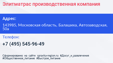 Элитматрас, производственная компания по адресу 143985, Московская область, Балашиха, Автозаводская, 50а в дальнейшем Организация, размещена в следующих категориях: