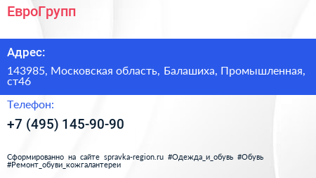 ЕвроГрупп по адресу 143985, Московская область, Балашиха, Промышленная, ст46 в дальнейшем Организация, размещена в следующих категориях: