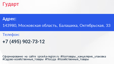 Гударт по адресу 143980, Московская область, Балашиха, Октябрьская, 33 в дальнейшем Организация, размещена в следующих категориях:
