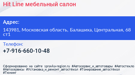 Hit Line, мебельный салон по адресу 143981, Московская область, Балашиха, Центральная, 68 ст1 в дальнейшем Организация, размещена в следующих категориях: