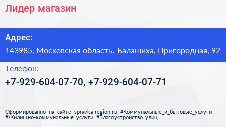 Лидер, магазин по адресу 143985, Московская область, Балашиха, Пригородная, 92 в дальнейшем Организация, размещена в следующих категориях: